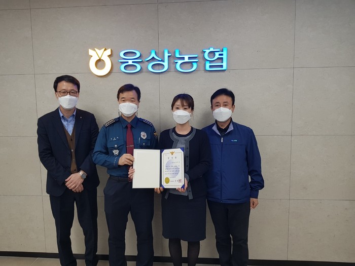 양산경찰서는(서장 정성학) ’21. 2. 26.(금) 웅상 농협 평산지점 을 방문, 보이스 피싱 예방 유공 직원에 대한 감사장을 수여하였다. 이 자리에는 조합장(안용우), 지점장(이흥렬)과 유공 직원 윤지은 등이 참석하였다.