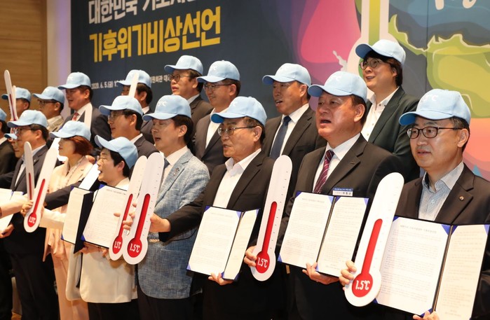 유동균 서울 마포구청장이 최근 국회의원회관 대회의실에서 열린 '대한민국 기초지방정부 기후위기 비상선언 선포식'에 참석했다. 사진은 유 구청장이 타 지방자치단체장 등과 함께 정부와 국회에 기후위기 비상상황임을 선포하고 국가 2050 탄소중립을 선언할 것을 요구하는 모습. (사진제공=마포구청)