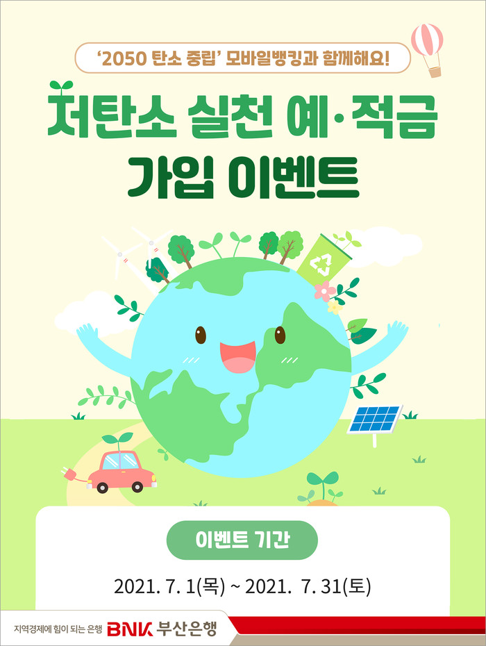 [시민일보 = 여영준 기자] BNK부산은행은 오는 7월1~31일 친환경 금융상품인 ‘저탄소 실천 예·적금’ 모바일 가입 이벤트를 실시한다.