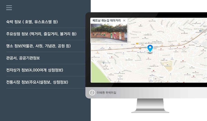 수집 데이터는 지역내 ▲숙박(호텔, 유스호스텔 등) ▲주요 상점 ▲명소(박물관, 사원, 기념관, 공원, 문화재 등) ▲전자상가 ▲전통시장 ▲기타 생활편의시설(경찰관, 대사관, 출입국관리소 등) 등에 관한 정보다.