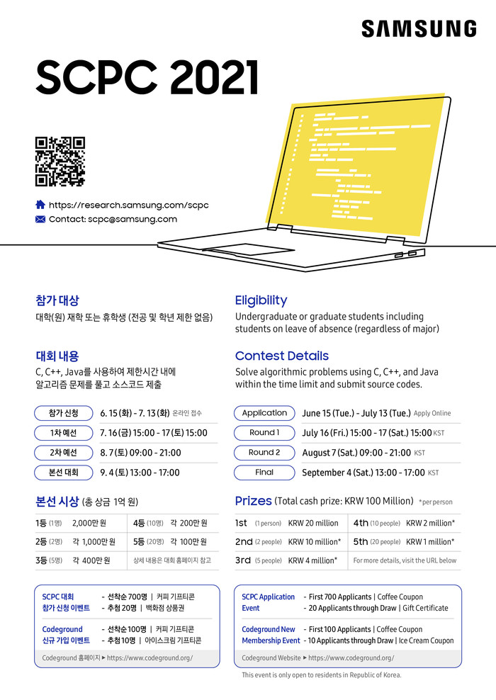 '삼성전자 대학생 프로그래밍 경진대회(SCPC)'는 제한시간 내에 알고리즘 문제를 풀고 소스코드를 제출하는 대회로, 수상자들에게 총 1억 원의 상금과 삼성전자 채용 우대 혜택이 주어진다.