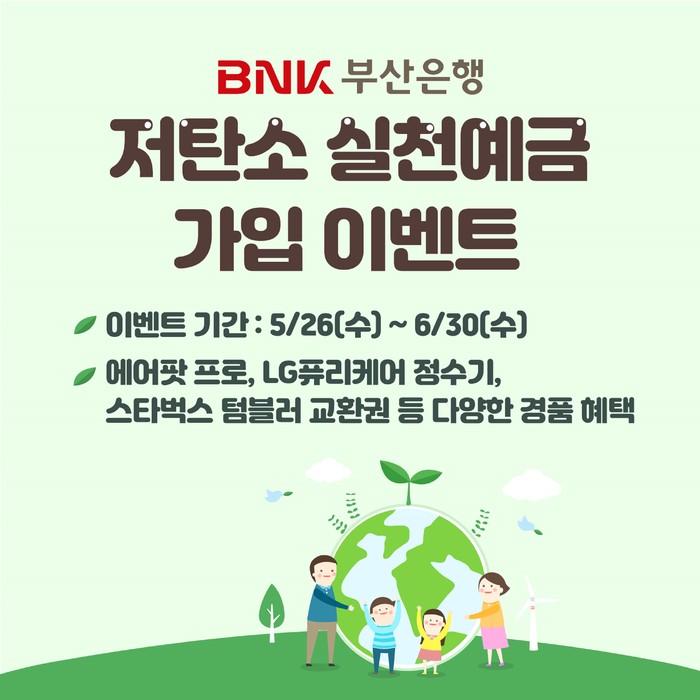 [시민일보 = 여영준 기자] BNK부산은행이 오는 6월30일까지 ‘저탄소 실천 예금’ 가입 고객을 대상으로 경품 증정 이벤트를 실시한다.