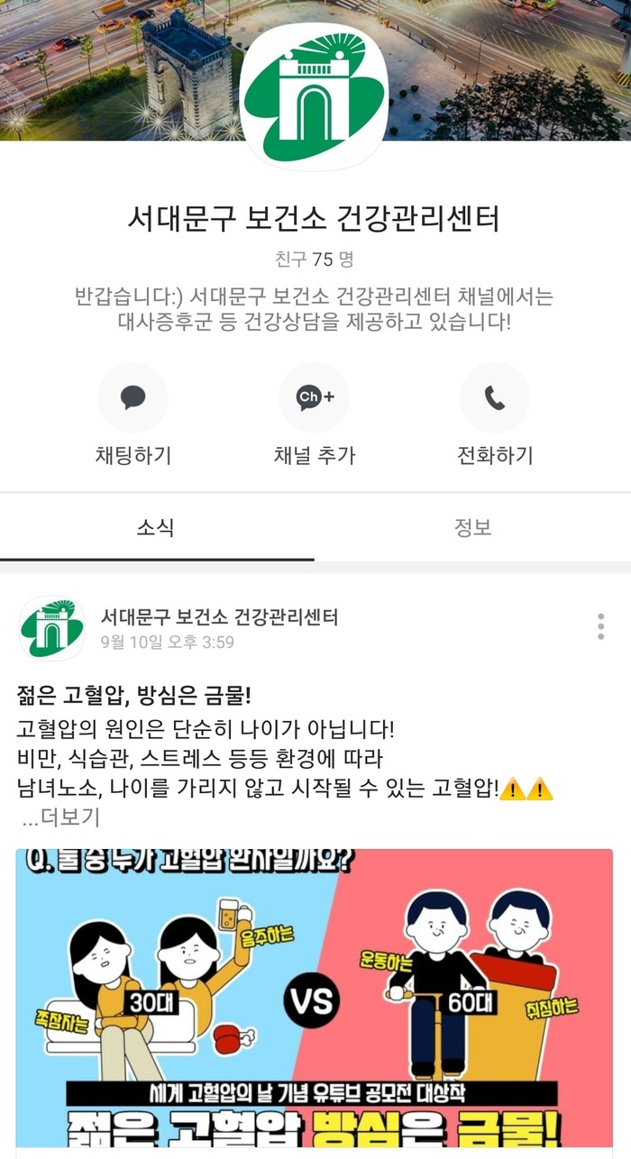 | ▲ 카카오톡에 개설된 '서대문구보건소 건강관리센터' 채널. (사진제공=서대문구청) |