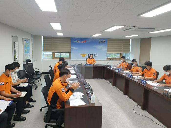 ▲ 완도소방서 장마철 호우대비 상황판단회의 진행 모습. (사진제공=완도소방서) |