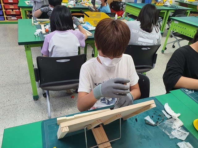 수업은 개념정리와 그간의 고정관념을 깨는 이야기들로 시작해 다양한 공구와 재료를 이용한 나만의 독서대 제작 및 아크릴과 LED의 특성을 살려 실생활에서의 활용도가 높은 무드등 조립으로 이어졌다. 또한, 오토마타의 원리를 터득한 후 걸어다니는 로봇 강아지를 만들어 달리기 시합을 벌이면서 성취감을 만끽하는 시간으로 마무리 됐다.