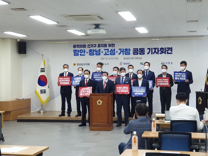경남도 내 광역선거구 축소위기지역인 함안·창녕·고성·거창 4개 군이 2022년 치러질 지방선거 선거구 축소에 반대하기 위해 13일 기자회견을 가졌다.