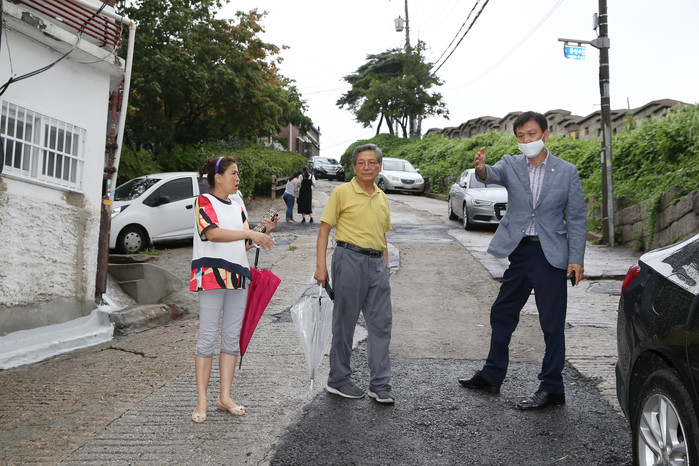 | ▲ 라도균 의원(오른쪽)이 주민들과 도로를 점검하며 문제점에 대해 이야기를 나누고 있다. (사진제공=종로구의회) |