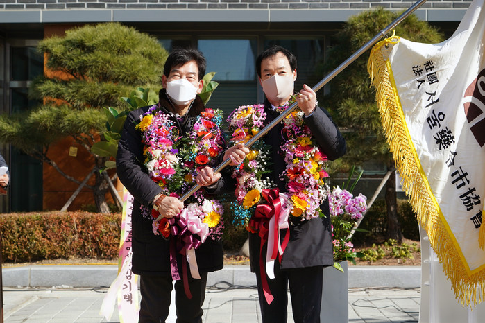 서울 동대문구 서울약령시협회가 17일 서울약령시협회장 이·취임식을 진행했다. 이날 11대 서울약령시협회 회장으로 김월진 회장이 취임해 회원 상호간의 소통을 통한 단합 등 향후 회무 진행 계획을 밝혔다. 사진은 이·취임식에서 김 회장(오른쪽)과 최영섭 10대 회장이 기념촬영을 하고 있는 모습. (사진제공=동대문구청)