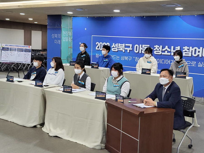 서울 성북구가 최근 2022년 성북구 아동청소년 총회를 온·오프라인으로 개최했다. 총회에서는 아동청소년 참여예산에 편성될 후보사업 8건을 제안한 청소년들이 참석해 각자 자신의 제안사업을 설명했으며, 청소년들이 온라인으로 참여해 사업제안 청소년들과 1대1로 사업에 대한 질의·응답을 진행했다. 사진은 성북구 아동청소년 총회가 진행되고 있는 모습. (사진제공=성북구청)