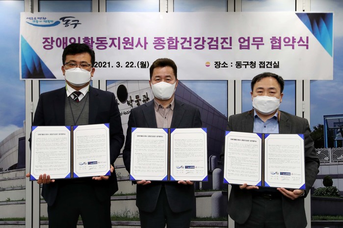 인천 동구는 지난 22일 인천백병원, 동구 지역자활센터와 3자 간 장애인활동지원사의 종합건강검진 지원을 위한 협약을 체결했다. 이번 협약에 따라 지역내 활동 지원기관에서 근무하는 활동지원사들은 인천백병원에서 종합건강검진을 받을 경우 1인당 20만원의 검진비용을 지원받게 된다. 사진은 허인환 구청장(가운데) 및 관계자들이 협약서를 들고 기념촬영을 하는 모습. (사진제공=동구청)