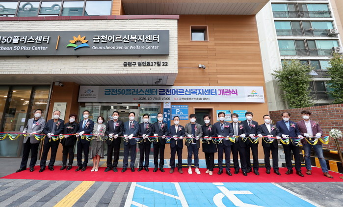 서울 금천구는 지난 16일 50+세대 및 노인세대를 위한 복합시설인 ‘금천50플러스센터’ 및 ‘금천어르신복지센터’ 개관식을 개최했다. 사진은 금천50+센터 및 금천어르신복지센터 개관식에서 참석한 내빈들이 테이프커팅을 하고 있는 모습. (사진제공=금천구청)