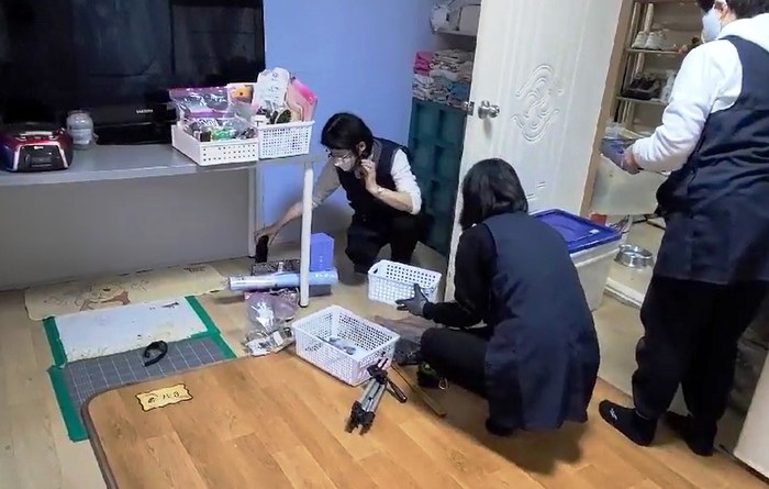 | ▲ 지난 11일 구 사회적경제통합지원센터 신박한 구조대와 주민기술학교 반려동물 돌보미, 정리수납 전문가 과정 실습생들이 지역내 기초수급 가구를 방문해 집안을 정리하고 있다. (사진제공=용산구청) |