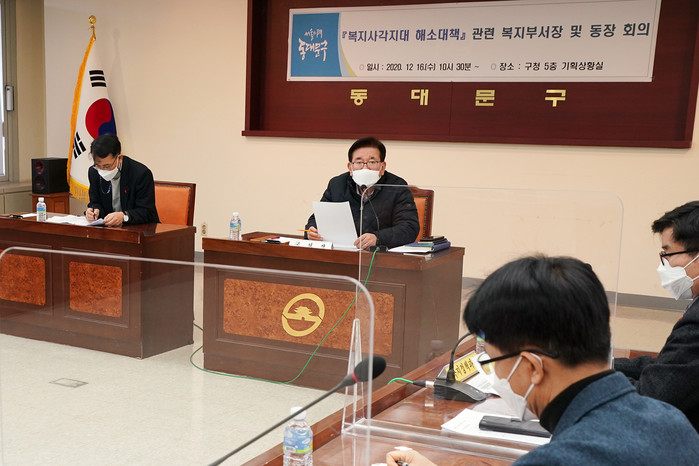 16일 유덕열 서울 동대문구청장이 구청 5층 기획상황실에서 지역내 복지사각지대 해소를 위한 대책회의를 열고, 복지 관련 부서장 및 14개 동장과 함께 복지사각지대 발굴 사례와 지원현황 등에 대해 논의했다. 사진은 회의를 주재하고 있는 유 구청장(가운데)이 발언을 하고 있는 모습. (사진제공=동대문구청)