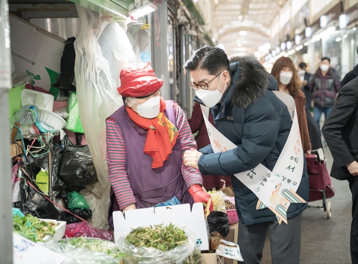 이정훈 서울 강동구청장이 지난 2일 지역내 전통시장을 방문해 코로나19로 어려움을 겪고 있는 시장 상인들을 격려했다. 이날 방문은 설 명절 물가동향 파악과 전통시장 활성화를 위한 것으로 5일까지 지역내 6개 전통시장을 방문한다. 사진은 이 구청장(오른쪽)이 명일전통시장을 방문해 상인을 격려하고 있는 모습. (사진제공=강동구청)