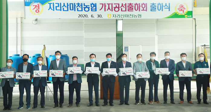이날 행사는 지리산마천농협(조합장 조원래)과 가지작목반(반장 김영호)이 공선회를 조직하여 광주, 대전 대도시 공판장으로 계통출하는 하는 첫날로 서춘수 함양군수, 황태진 군의장, 노기창 NH농협은행 함양군지부장, 지역농업조합장 및 생산농가 등 50여명이 참석했다.