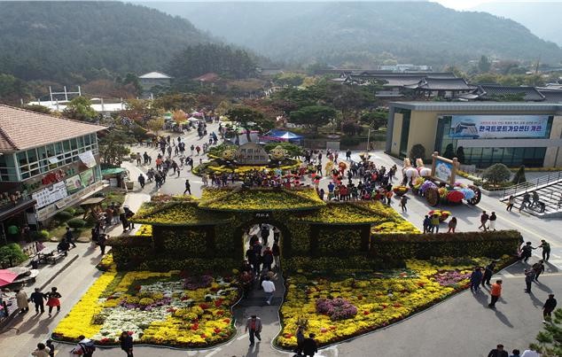 | ▲ 영암군 국화축제장 전경 / 사진은 지난 2019년 10월 말부터 11월 중순까지 기찬랜드에서 열렸던 국화축제장에 관광객들로 붐비고 있다. / 영암군 제공 |