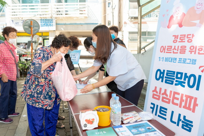양천구가 코로나19의 장기화에 따른 사회적 단절로 노인들이 느낄 고립감과 우울함을 조금이나마 해소하기 위해 원예·공예·인지 활동 등의 소일거리로 구성된 1대1 비대면 키트를 제공한다. 사진은 복지관 관계자가 노인들에게 비대면 키트를 배부하고 있는 모습. (사진제공=양천구청)
