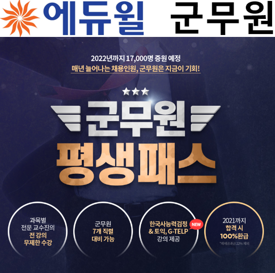 2021년까지 시험에 최종합격할 경우 제세공과금을 제외한 수강료를 전액 환급해주고, 불합격시 다음 시험일까지 수강기간을 무상으로 연장해주는 ‘군무원 평생패스’ 과정은 에듀윌 홈페이지를 통해 수강신청 및 자세한 내용 확인이 가능하다.