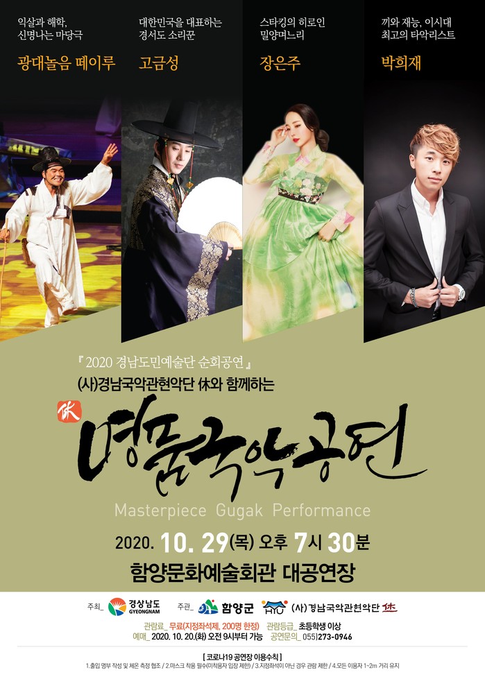 경상남도가 주최하고 함양군이 주관한 이번 공연은 국악 관현악으로 마당극 ‘맹인잔치길 경사났네’와 모듬북 협주곡(스톰), Movie & Sound(캐리비안의 해적/알라딘/미션임파서블 O.S.T), 국악가요(나 가거든, 아름다운 나라), 창과 관현악(新 이수일과 심순애) 등을 선보인다.