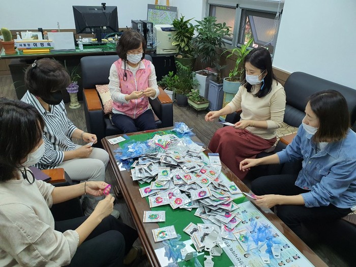 경기 안산시 최근 상록구 사동주민협의회는 코로나19로 침체된 지역 상권을 살리고 어려움을 겪고 있는 소상공인 자영업자를 응원하기 위해 마스크 스트랩을 제작해 전달했다. 사진은 회원들이 직접 만든 마스크 스트랩의 포장 작업을 하고 있는 모습. (사진제공=안산시청)