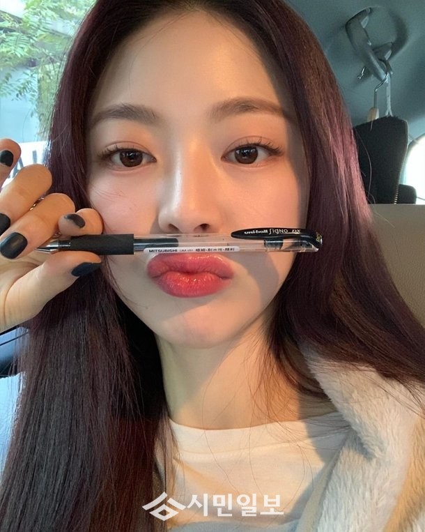 사진 속 임보라는 차에 앉아서 볼펜을 인중 위에 올려다 놓고 입술을 쭉 내밀고 있는 모습으로 시선을 사로잡았다.