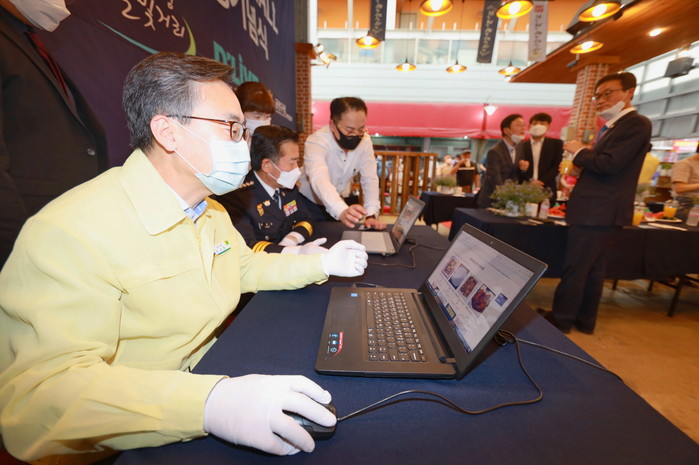 서울 금천구는 최근 ‘대명여울빛거리시장 딜라이브몰 입점 기념식’을 개최했다. 대명여울빛거리시장은 지난 2월 말 딜라이브몰과 업무협약을 체결, 전통시장 상품을 스마트폰으로 구매할 수 있는 온라인 쇼핑환경을 조성했다. 사진은 기념식에서 유성훈 구청장(왼쪽)이 딜라이브몰을 통해 전통시장 물건 구매를 시연하고 있는 모습. (사진제공=금천구청)
