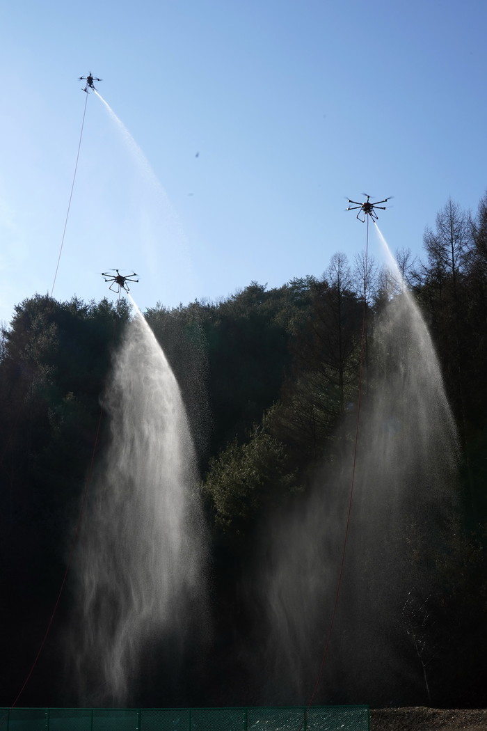 8일 강원 원주시 소재 산림항공본부에서 열린 '주·야간 산불대응 현장 시연회'에서 드론이 산불 진화약제를 살포하고 있다.
