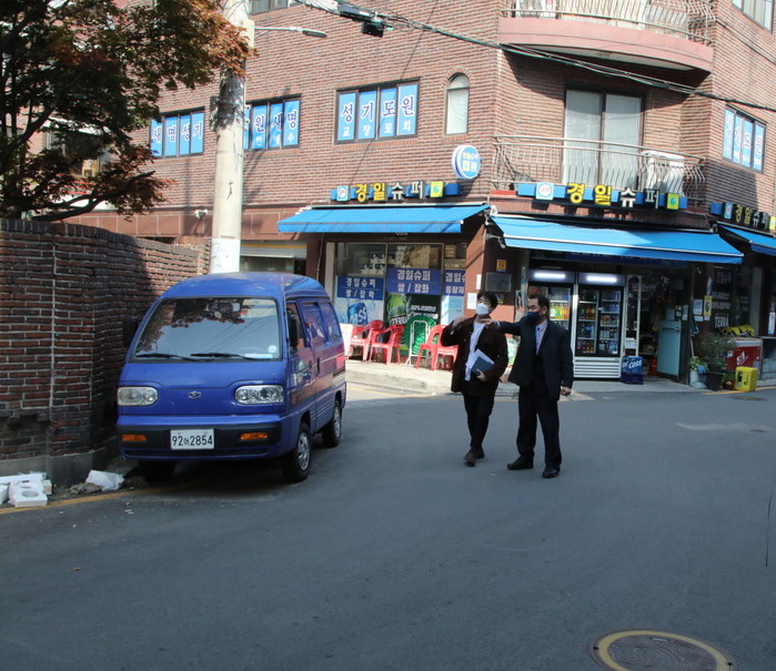| ▲ 창흥2동 이면도로를 찾은 박진식 의장(오른쪽)이 현장을 살펴보고 있다. |