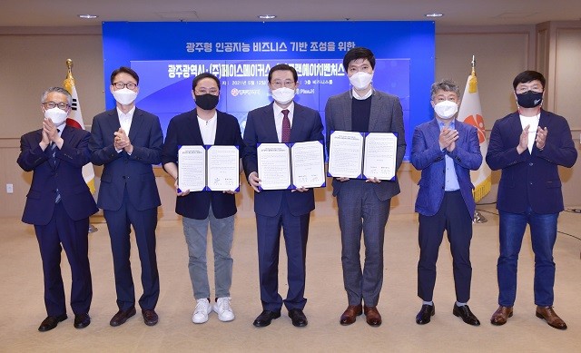 광주시는 12일 시청 비즈니스룸에서 이용섭 시장, 김경락 ㈜페이스메이커스 대표, 원한경 ㈜플랜에이치벤처스 대표 등이 참석한 가운데 90~91번째 ‘인공지능 산업 투자생태계 조성을 위한 업무협약’을 체결했다.