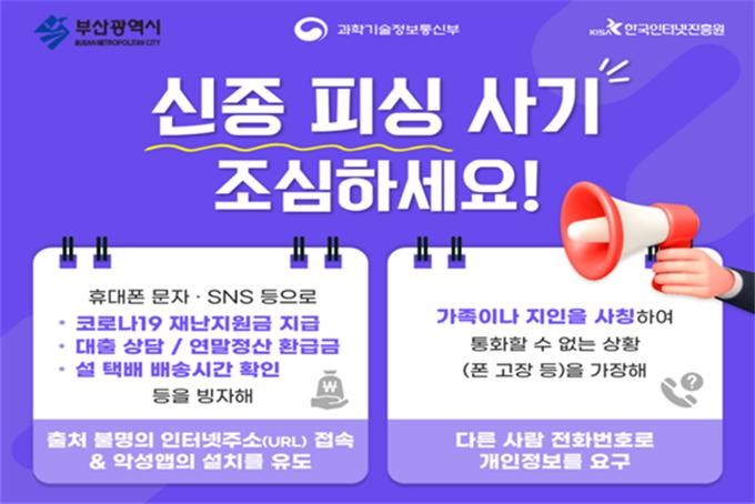 부산시(시장 박형준)는 코로나19 관련 재난지원금 빙자 스미싱 문자와 정부기관·금융기관 등을 사칭한 해킹메일·악성 앱 등에 의한 시민들의 해킹 피해를 예방하기 위해 국가정보원 부산지부와 함께 4월부터 9월까지 사이버보안 및 개인정보보호 캠페인을 시행한다고 밝혔다.