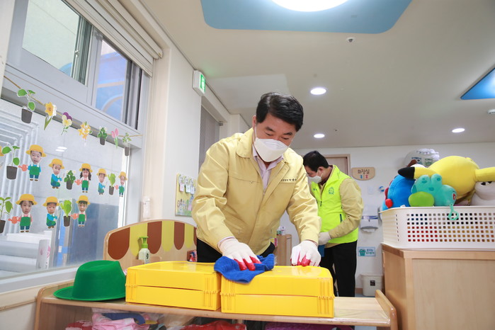 박준희 서울 관악구청장은 어린이집 휴원조치가 해제, 개원함에 따라 지역내 어린이집의 코로나19 감염 위험을 최소화하기 위해 지난 30~31일 어린이집 방역활동을 직접 지원했다. 사진은 박 구청장이 어린이집 실내외 시설에 대한 방역을 실시하고 있는 모습. (사진제공=관악구청)