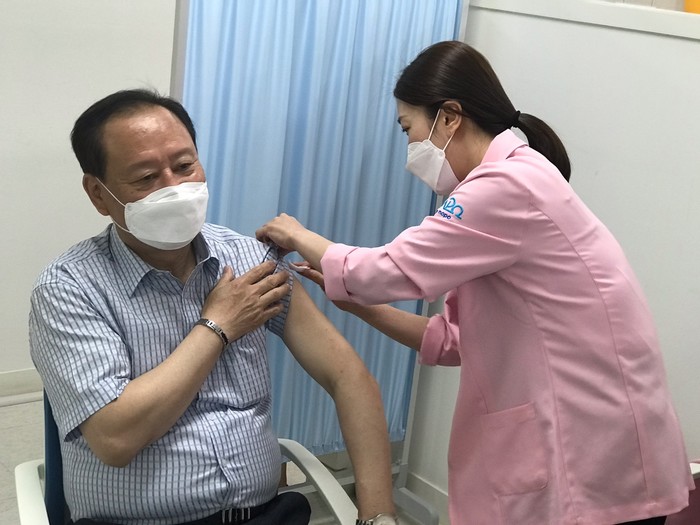 유동균 마포구청장은 7일 마포구보건소에서 아스트라제네카(AZ) 백신 2차 예방접종을 받았다. 사진은 유 구청장이 아스트라제네카(AZ) 백신 주사를 맞고 있는 모습. (사진제공=마포구청)
