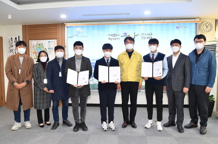 경기 (재)하남교육재단이 최근 '2020년 하반기 장학증서 수여식'을 개최했다. 재단은 시에 2년 이상 계속 거주한 학생, 시민의 자녀를 대상으로 일반(저소득)·성적우수 부문 등의 장학생을 모집했고, 총 202명의 학생에게 1억2500만원의 장학금 지급을 결정했다. 사진은 김상호 시장(오른쪽 네 번째)과 수여대상자 학생 대표들이 기념촬영을 하는 모습. (사진제공=하남시청)