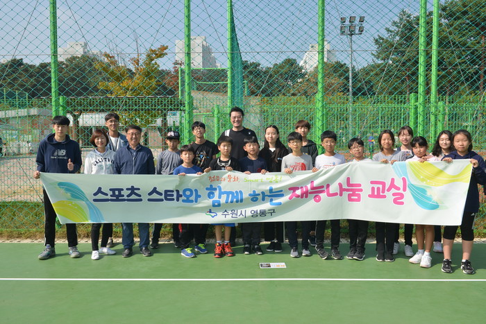 경기 수원시 영통구는 20일 올해 성공적으로 진행되고 있는 '스포츠스타와 함께 하는 재능나눔 교실'의 일환으로 '김훈 농구교실'을 개최했다. 김훈 감독은 90년대 중반 연세대 소속으로 한국 농구의 전성기를 이끌었던 주역 중의 한 명이다. 사진은 김 감독과 청소년들이 기념촬영을 하는 모습. (사진제공=영통구청)