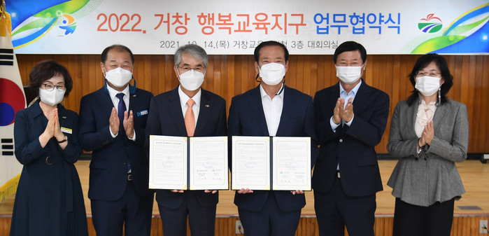 거창군은 14일 거창교육지원청 회의실에서 구인모 거창군수를 비롯해 박종훈 경상남도교육감과 강신영 거창교육지원청 교육장 등 교육청·군청 관계자와 초·중·고 학부모 대표 30여 명이 참석한 가운데 ‘2022 거창행복교육지구사업 업무협약(MOU) 체결식’을 가졌다.
