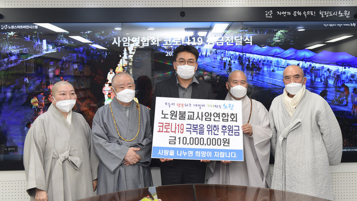 서울 노원구는 최근 구청장실에서 노원불교사암연합회와 ‘코로나19 극복 후원금 전달식’을 개최했다. 이날 노원불교사암연합회에서 코로나19 극복을 위한 후원금 1000만원을 전달했다. 사진은 오승록 구청장(가운데)과 관계자들이 기념촬영을 하는 모습. (사진제공=노원구청)