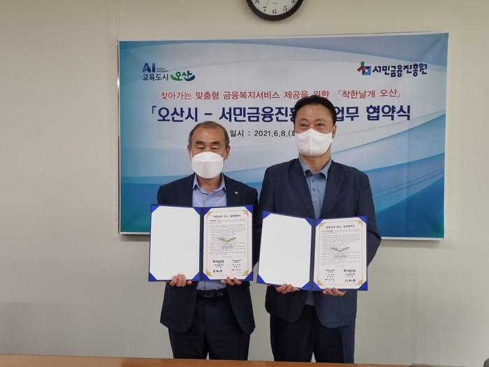 경기 오산시가 8일 서민금융진흥원과 함께 찾아가는 맞춤형 금융복지 서비스 제공 및 위기가구 발굴 지원을 위한 '착한 날개 오산' 업무 협약을 체결했다. 이번 협약에 따라 ▲금융·복지서비스 대상자 발굴 및 의뢰 ▲찾아가는 이동 금융상담 지원 등을 함께 추진해 나갈 예정이다. 사진은 협약 체결 후 양 기관 관계자들이 기념촬영을 하는 모습. (사진제공=오산시청)