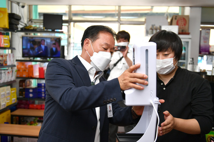 경기 양평군은 최근 양동면 양동쌍학시장 점포상인들에게 방역물품으로 고객이 점포 출입시 발열체크와 손소독이 가능한 자동 체온측정기 및 손소독제 거치대 100개와 소독제 2000리터를 배포했다. 사진은 이날 방역물품 배포에 참여한 정동균 군수(왼쪽)가 상인들에게 자동 체온측정기 및 손소독제 거치대 사용법을 설명하고 있는 모습. (사진제공=양평군청)