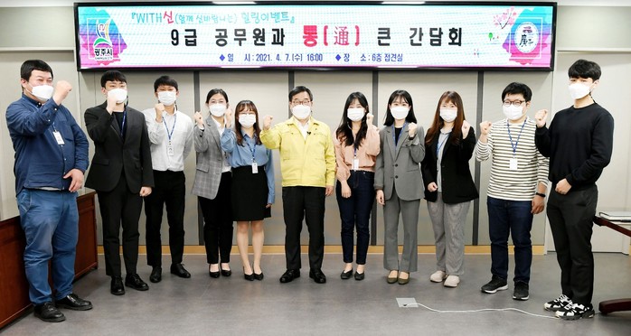 경기 광주시는 지난 7일 1년여간 공직생활을 경험한 10명의 9급 주무관들과 신동헌 시장이 자유롭고 편안한 분위기 속에서 일문일답 방식으로 소통하는 ‘통(通) 큰 간담회’를 개최했다. 사진은 이날 간담회에서 신 시장(가운데)과 주무관들이 기념촬영을 하는 모습. (사진제공=광주시청)