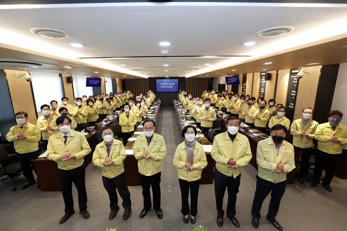 김수영 서울 양천구청장은 28일 간부 및 명예동장들과 함께 코로나19 환자 치료에 힘쓰고 있는 의료진들을 응원하는 릴레이 캠페인 ‘덕분에 챌린지’에 동참했다. 사진은 김 구청장(오른쪽 세 번째)이 구 관계자들과 함께 수화 동작을 하며 의료진에 응원 메시지를 보내고 있는 모습.(사진제공=양천구청)