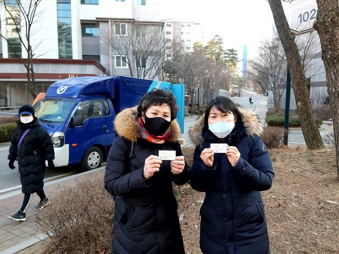 서울 은평구 진관동 주민센터는 최근 복지사각지대 위기가구를 발굴하기 위해 '내 이웃의 사이다(사이좋은 이웃과 다함께 행복한 동네)' 명함을 제작했다. 우리동네주무관이 지역의 복지통반장 및 각종 직능단체 등에 이 명함을 전달하고 있다. 사진은 복지 통장과 우리동네주무관이 명함을 들어보이고 있는 모습. (사진제공=은평구청)