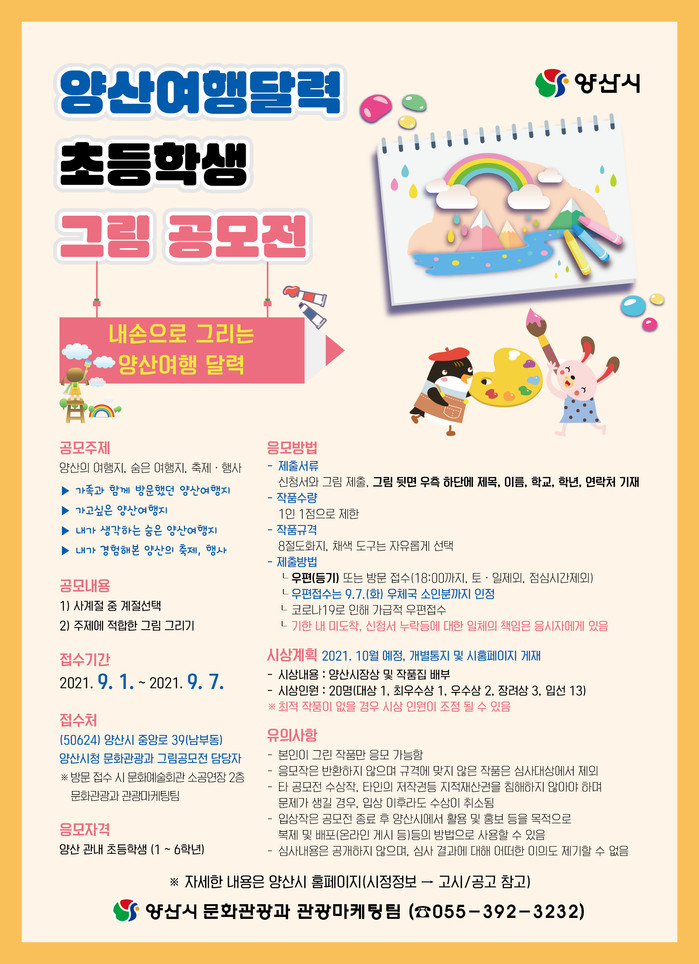공모는 양산 관내 초등학생을 대상으로 진행되며 작품은 1인당 1점까지 접수 가능하다. 접수기간은 2021년 9월 1일부터 9월 7일까지다.
