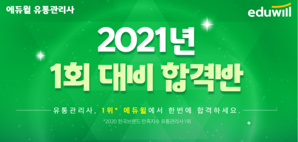 [시민일보 = 여영준 기자] 종합교육기업 에듀윌(대표 박명규) 유통관리사는 오는 5월15일로 예정된 2021년 제1회 유통관리사 시험에 대비해 ‘2021년 1회 대비 합격반’을 선보였다고 밝혔다.