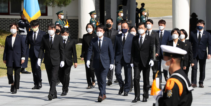 정의당 김종철 신임 대표를 비롯한 당 지도부가 11일 서울 동작구 국립현충원을 방문해 현충탑으로 향하고 있다.