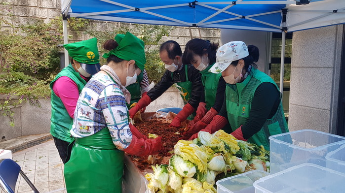 경기 구리시 교문2동에서는 26일 교문2동새마을부녀회 주관으로 회원 25명이 참여한 가운데 ‘사랑 나눔 홀몸노인 반찬(밑반찬, 김장김치) 만들어 드리기’를 진행했다. 사진은 부녀회 관계자들이 김장을 하고 있는 모습. (사진제공=구리시청)
