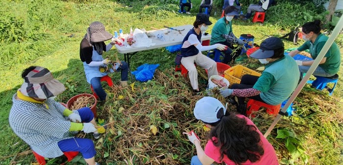 경기 동두천시 보산동 주민자치위원회가 지난 18일 보산동 행정복지센터 앞 텃밭에서 ‘소외계층을 위한 행복 텃밭 강낭콩 수확봉사’를 전개했다. 이날 수확한 강낭콩 판매 수익금은 불우이웃 돕기 재원으로 사용될 예정이다. 사진은 이날 주민자치위원들이 강낭콩을 수확하고 있는 모습. (사진제공=동두천시청)