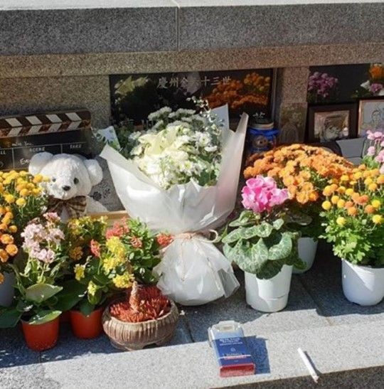 게재된 사진 속에는 김주혁을 추모하는 꽃다발, 인형, 담배 등이 놓여 있는 장지가 담겨있다.