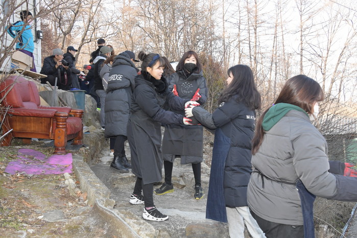 연예인 자원봉사단 ‘더 브릿지’는 지난 18일 설 명절을 앞두고 저소득층 노인들을 위해 경기 동두천시를 찾았다. 사진은 봉사활동 참여자들이 연탄을 나르고 있는 모습. (사진제공=동두천시청)