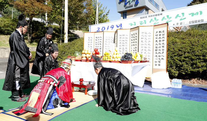 산청군이 11일 산청군민의 날을 기념해 시천면 중산관광지에서 제46회 지리산평화제 산신제례를 봉행했다.