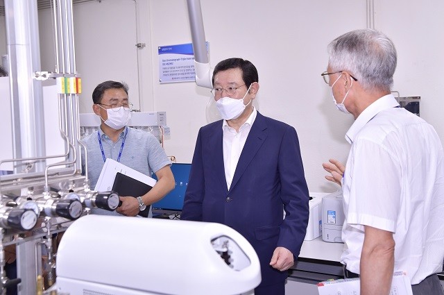 | ▲ 이용섭 광주광역시장이 21일 오후 남구 상수도사업본부 덕남정수장을 방문해 수돗물 공급 상황을 점검하고 무더위에 근무하고 있는 사업소 직원들을 격려한 후 현장을 둘러보고 있다./광주광역시 제공 |
